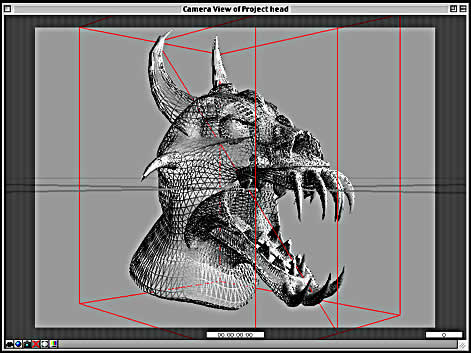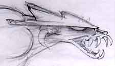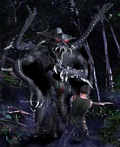 Above is an early version of the creature modeled in Lightwave 3D by key 3D artist, Anthony Rozycki. Notice how closely it resembles the 'mask' version of the creature. Later, more sketches were made that changed head structure, placement of the neck, and removal of the upper horns. |