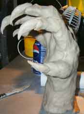 A clay model of the claw was also made so that the actor could wear it as a glove. To give you an idea of size, when worn, a human hand would only come up midway into the palm area! The mask (left) was molded and initial painting and texturing was done. After numerous experiments on camera tests, it was finally decideed not to go with traditional methods and instead create the creature on the computer. |