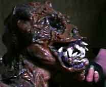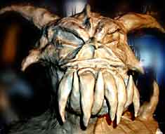 The initial concept for the creature was to have a tall man wear a costume with a mask and bodysuit. Cast for this role was 'Dez', the actor/stuntman who also plays the busdriver in the movie. To this end, a clay model of the mask was constructed by the key make-up FX artist, Jerry Pesce. On the left is a shot of the clay model. Before creating the final mask, the length of the teeth and other small changes were made. |
